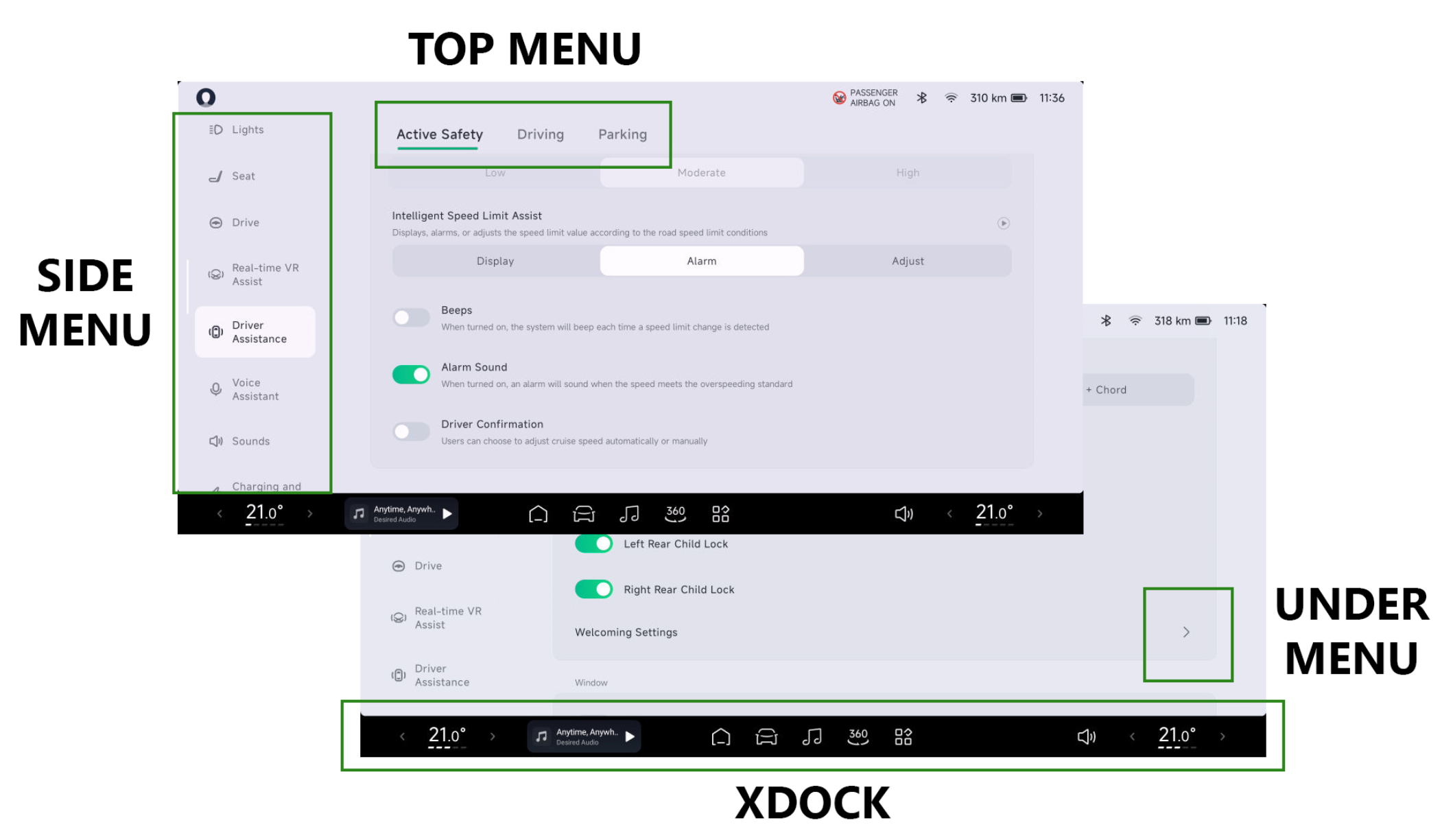 - Alarm ved overskridelse af fartgrænse: Aktiv (EU krav at det skal deaktiveres manuelt ved hver køretur)