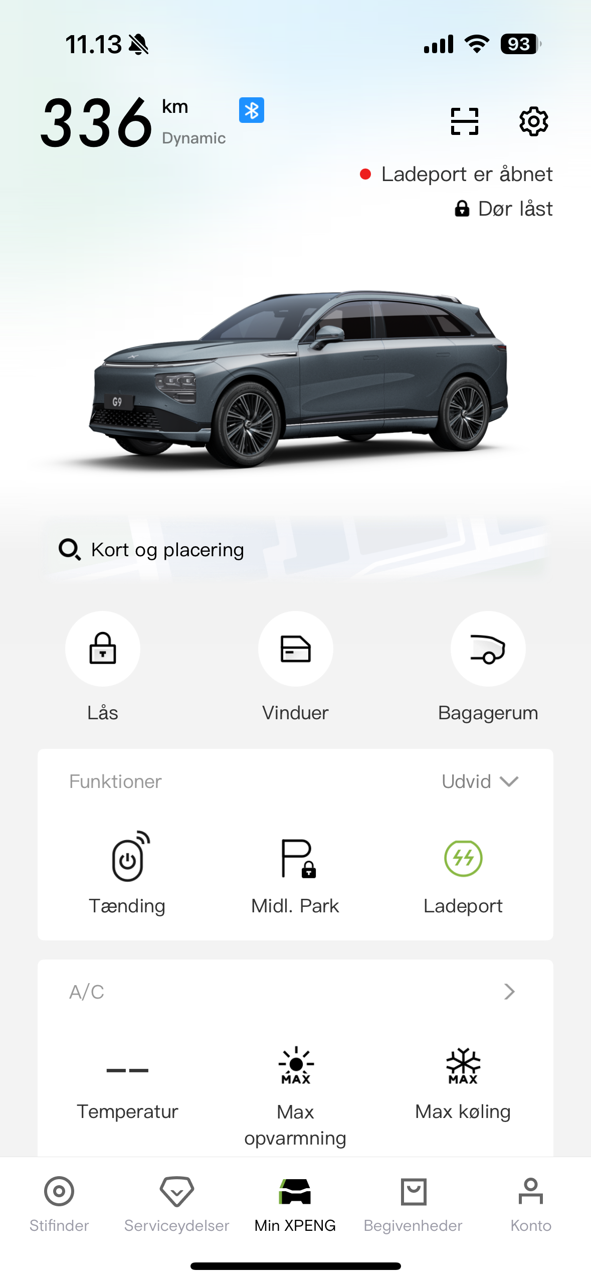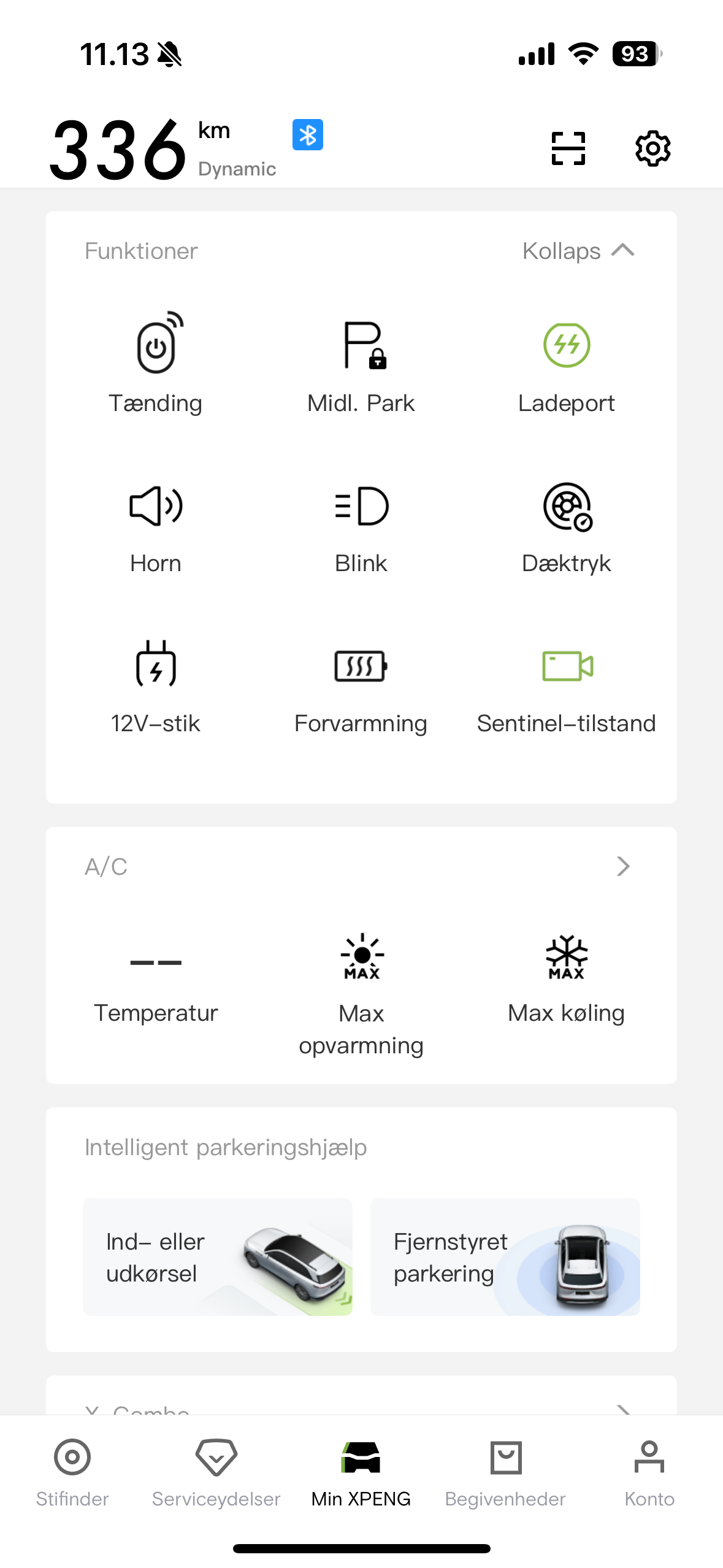 Da Min XPENG er startsiden i appen, og der hvor man betjener sin bil, gennemgår vi den først.